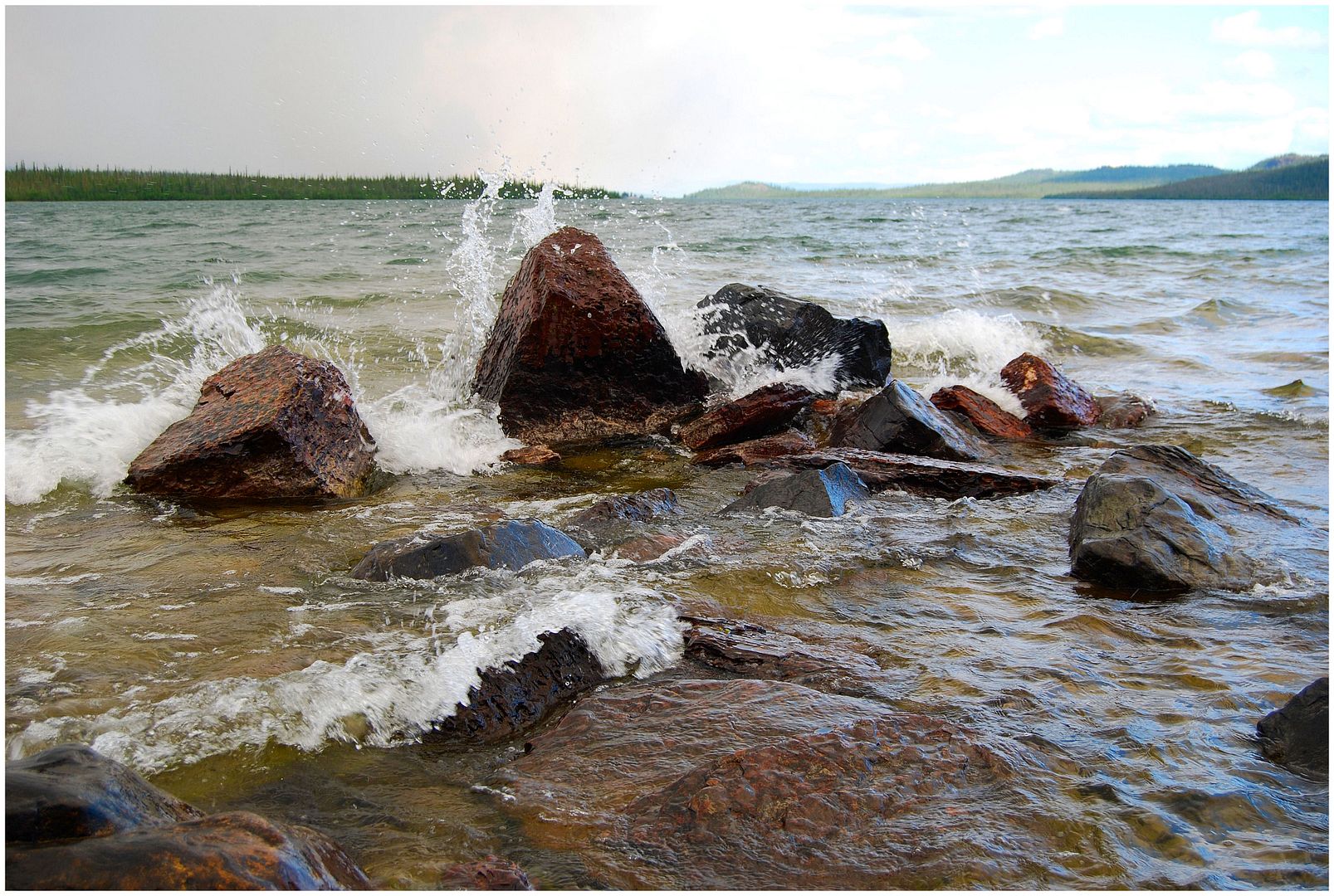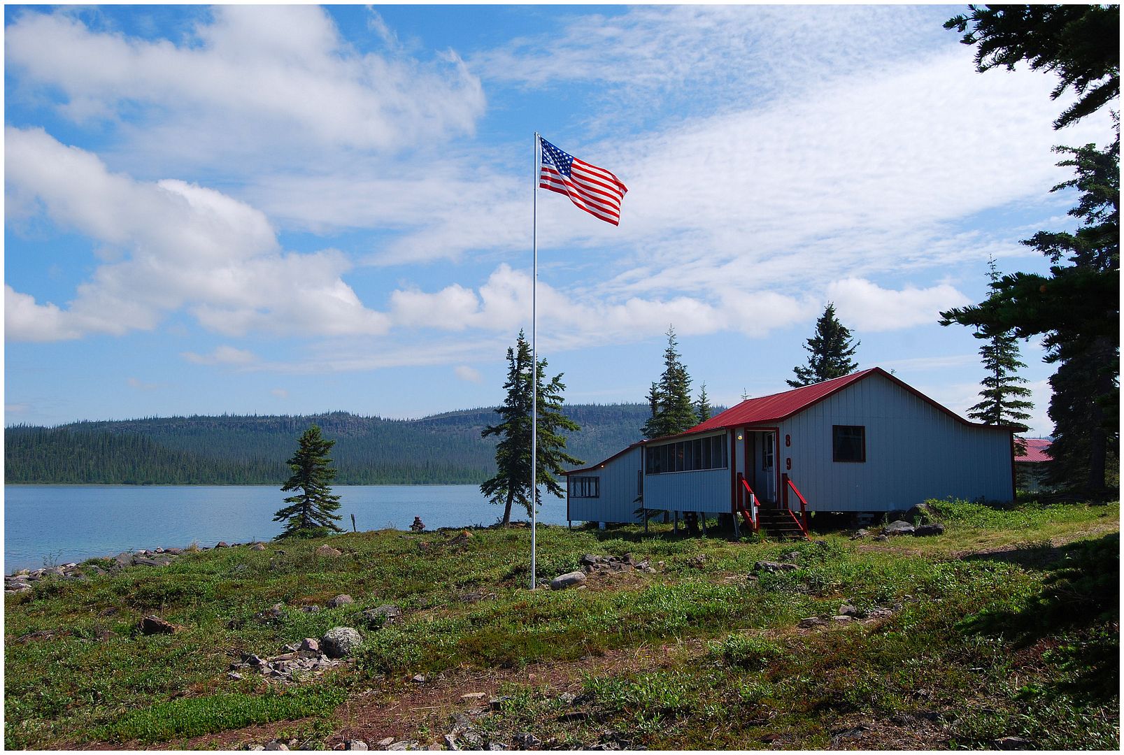 Claire’s ankle was reportedly feeling a little better once we returned to the lodge. Two fellas sharing drinks, Gary and his son Greg from Kansas staying in the adjacent room to us were out on the porch feeling even waaay better than that. Greg wanting to try fly fishing then too, he walked with me down to the shoreline where I pointed out a good spot to fling some casts. A submerged boulder close to shore on a small feeding shelf, I had caught some grayling there the evening before.