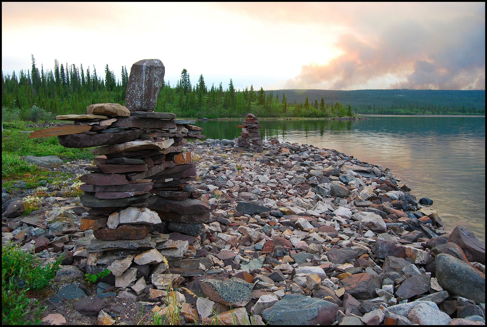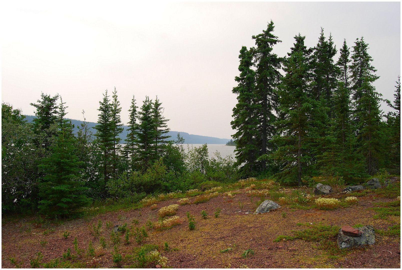 Approaching the lodge an orange haze lay low as the fires burned closer to camp. Bren’s ritual would be to clean up and catch a quick nap before dinner while I would skip the shoreline casting for grayling. Simple set-up for these hard hitters was an ultralight spinning rod with 10-pound braided line, to a 6-pound floro leader. Surely though, straight six mono would have been fine too. The spoons and spinners I noticed they were selling in the shop and which I saw on other’s lines were smallish, and wouldn’t cast all that far. A black Vibrax#3 spinner seemed to work great for me. Both grayling and lake trout hit it, and casting near that same submerged rock Greg had fly fished earlier, I sunk the hook into a heavier fish. An angry cream-sicle red nearly spooled me half a dozen times after hitting the spinner just twenty feet from shore, I had to at times brake the peeling spool and just hope. A real rush, I was pleased Bren woke in time to join me along the bank for this one-of-a-kind orange smoked redfin picture.