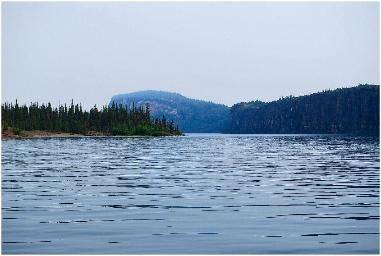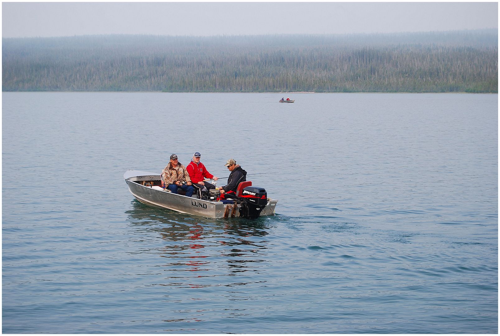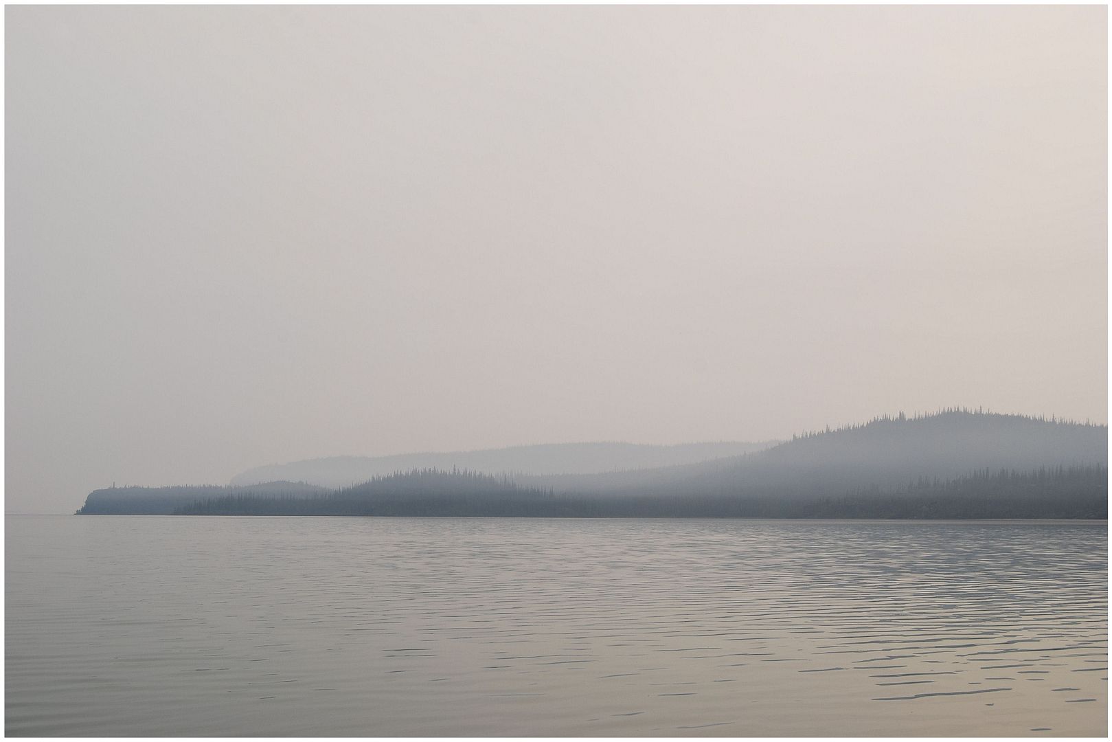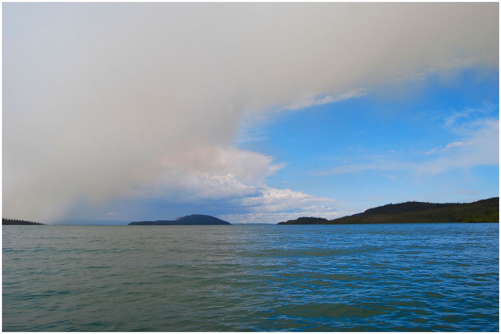 Woke rough this morning and had difficulty eating breakfast, but dunno why? Outside the fire continued to draw closer along the ridge, and now the winds had turned for the worst out of the northeast. While packing up our gear for the day, Bren and I stowed away extra valuables and clothing just in case returning to camp wasn’t possible after the days fishing. Leaving the dock the turning smoke was becoming heavy over camp, but bluer skies in the distance lay ahead. Maybe fish and fresher air would settle the stomach?