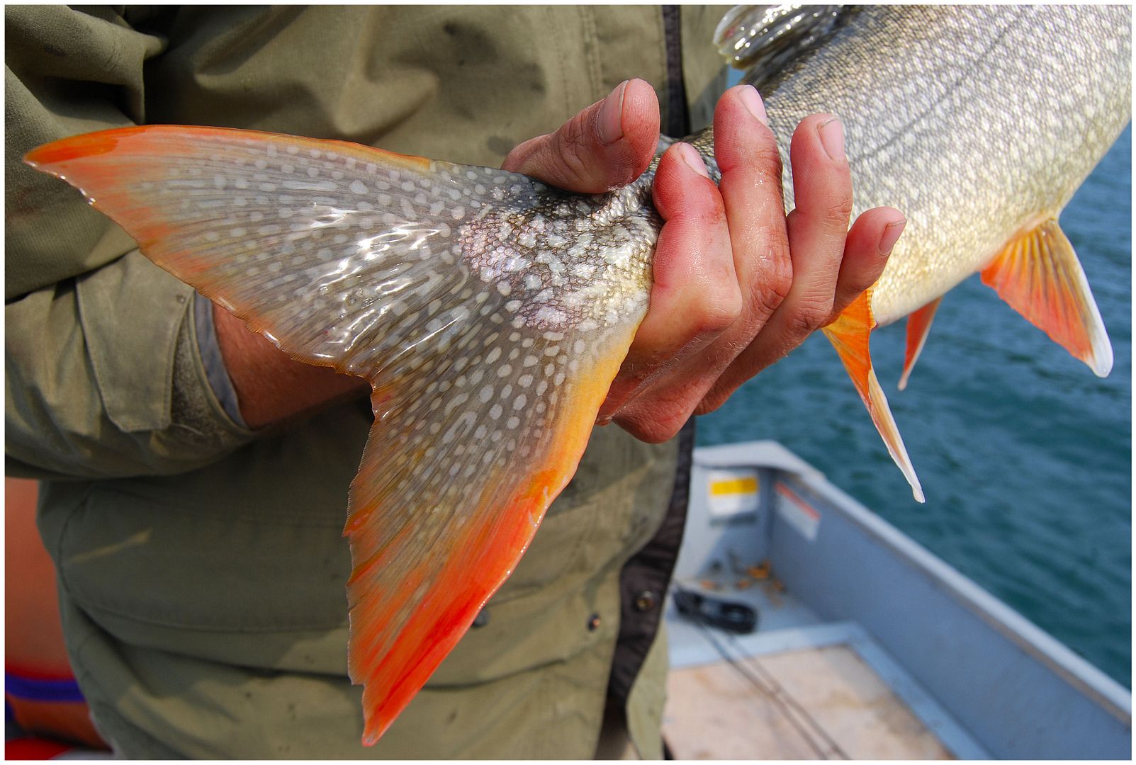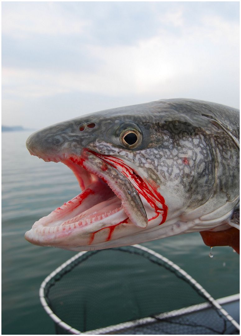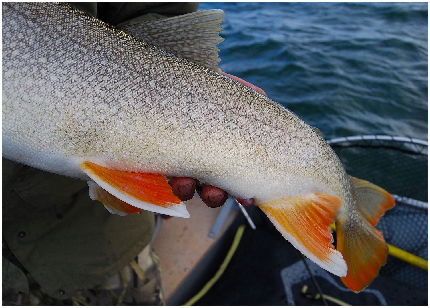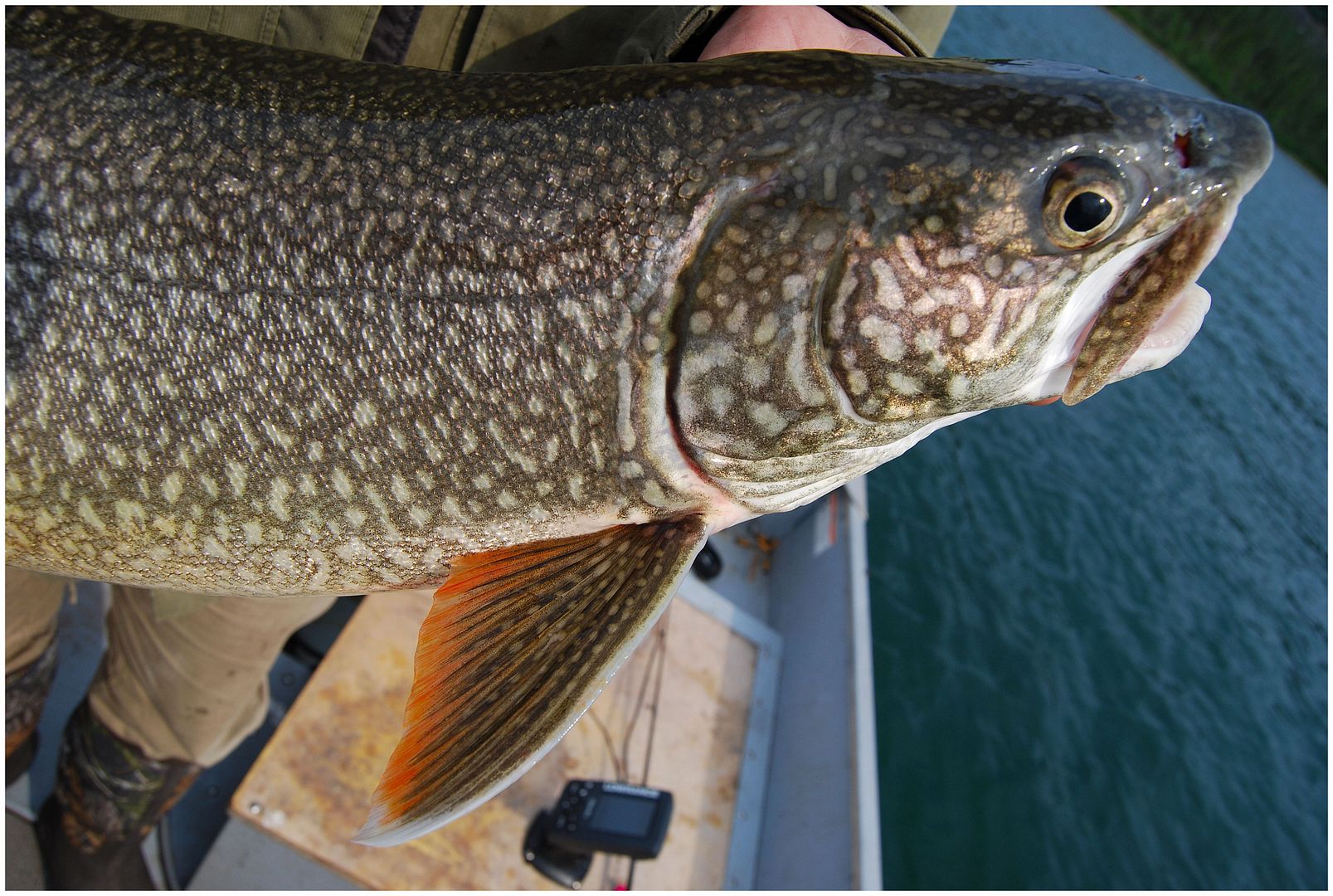 Picking our way home we found this point of many names holding a healthy tonne of actively biting fish. The first day refusing to take pictures of myself with any laker less than twenty pounds, we put a thorough beating on many fish weighing in at the 12 to 18 pound range. Big white bucks and plastic shads were the damage-doers, and Bren at this point was catching lakers two-to-one over me. Greys and reds both, these two different lake trout strains were feeding together, and it was hard but necessary to take a time out from catching fish and capture some of these stunning lakers with the lens.