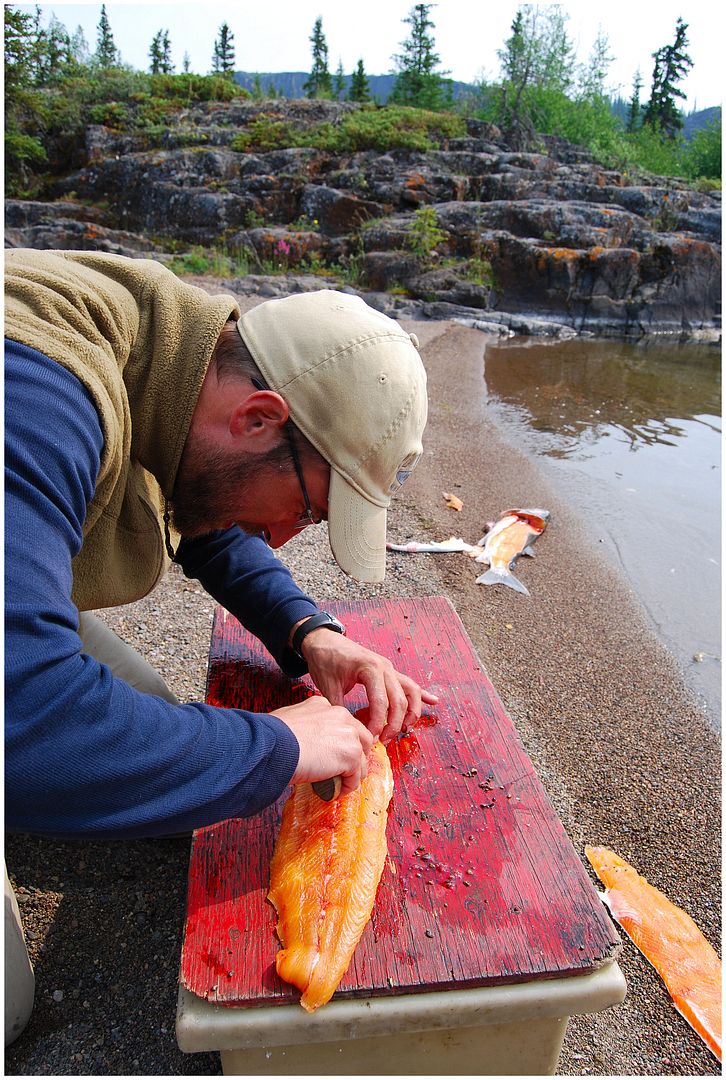 The first day or so with Adrian I honestly wondered about him a little. At onset, very energetic and talkative would describe him best. The more time I spent with him, the more I liked him. He is very much in fact a younger, busier and smarter version of myself. In his job as I expect in life, he inspects, details, processes and describes, doing this rapidly, much like an ER and outpost nurse often needs to. Quick witted it is easily understood that you are dealing with intelligence, and his education and knowledge of the outdoors and guiding surely prove this. Adrian chooses his lifestyle because he loves it most. To me, that epitomizes not only his willingness to risk, but an internal drive for adventure. Only his second year with Slave, he has many more years experience while guiding in Ontario and Manitoba. But, it’s not fishing he admits is even his specialty, it’s hunting. And through his other guiding business Adrian has led trophy hunters to muskox, moose, caribou, bear, wolf and other game in Canada, and during the same time outfitted others across African plains to hunt entirely foreign species. Listening to his many stories was interesting, but the way he can animate when telling a tale genuinely excites, there is good reason he is a published writer with Western Sportsman and Outdoor Canada. Bren and I both laughed heartily over the caribou and wolf Viking hunts… Funny guy too, he is actually a man after my own heart, and did I tell you he can cook? Turns out we grew up twenty minutes apart in the Ottawa valley.