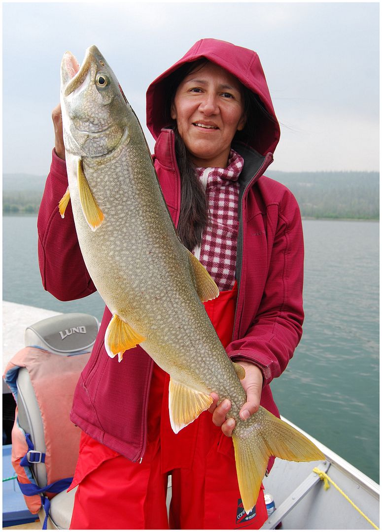 Jigging heavier baits on the long stick is not a style of fishing Bren is used to, and at Back Water she had to learn the ropes. This spot was fish loaded, lakers nippin’ and tuggin’ from 30 to 60 foot depths along a break fronting an inflowing creek. Her first big vertical battle she gut hooked a real skinny one which didn’t want to come up from bottom at all. Putting the gears to it, twisting some line and heaving the rod, she managed.