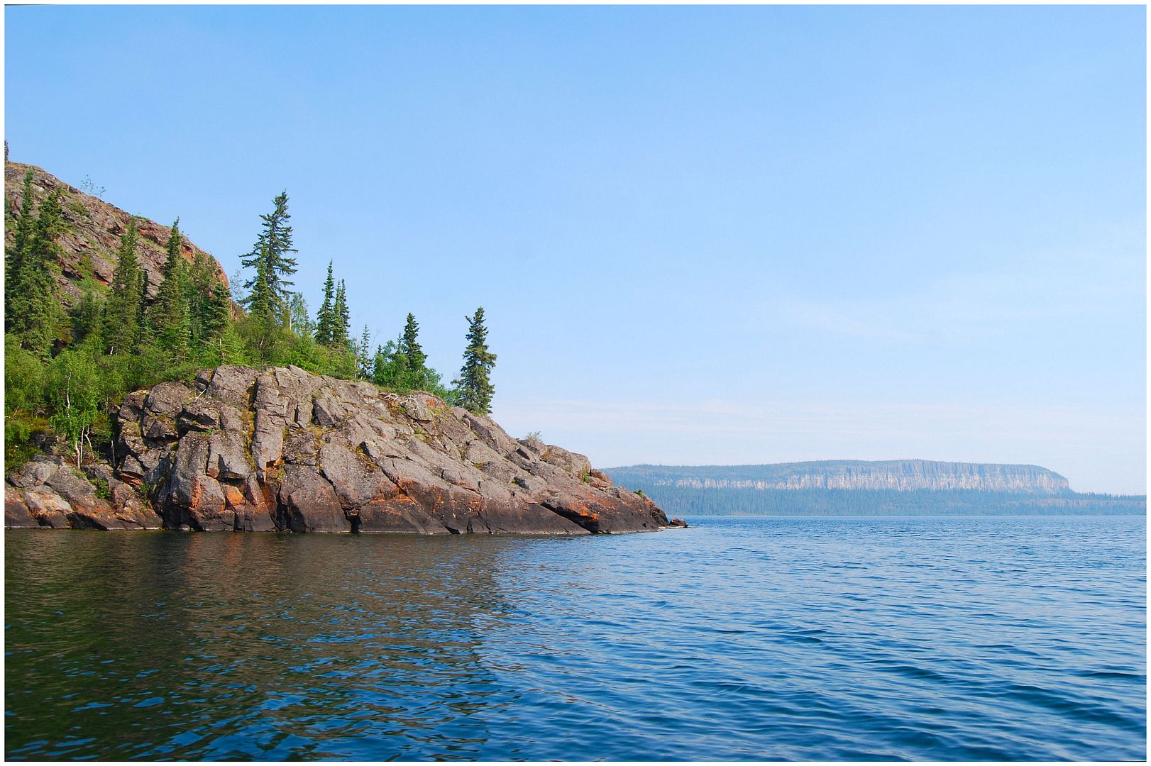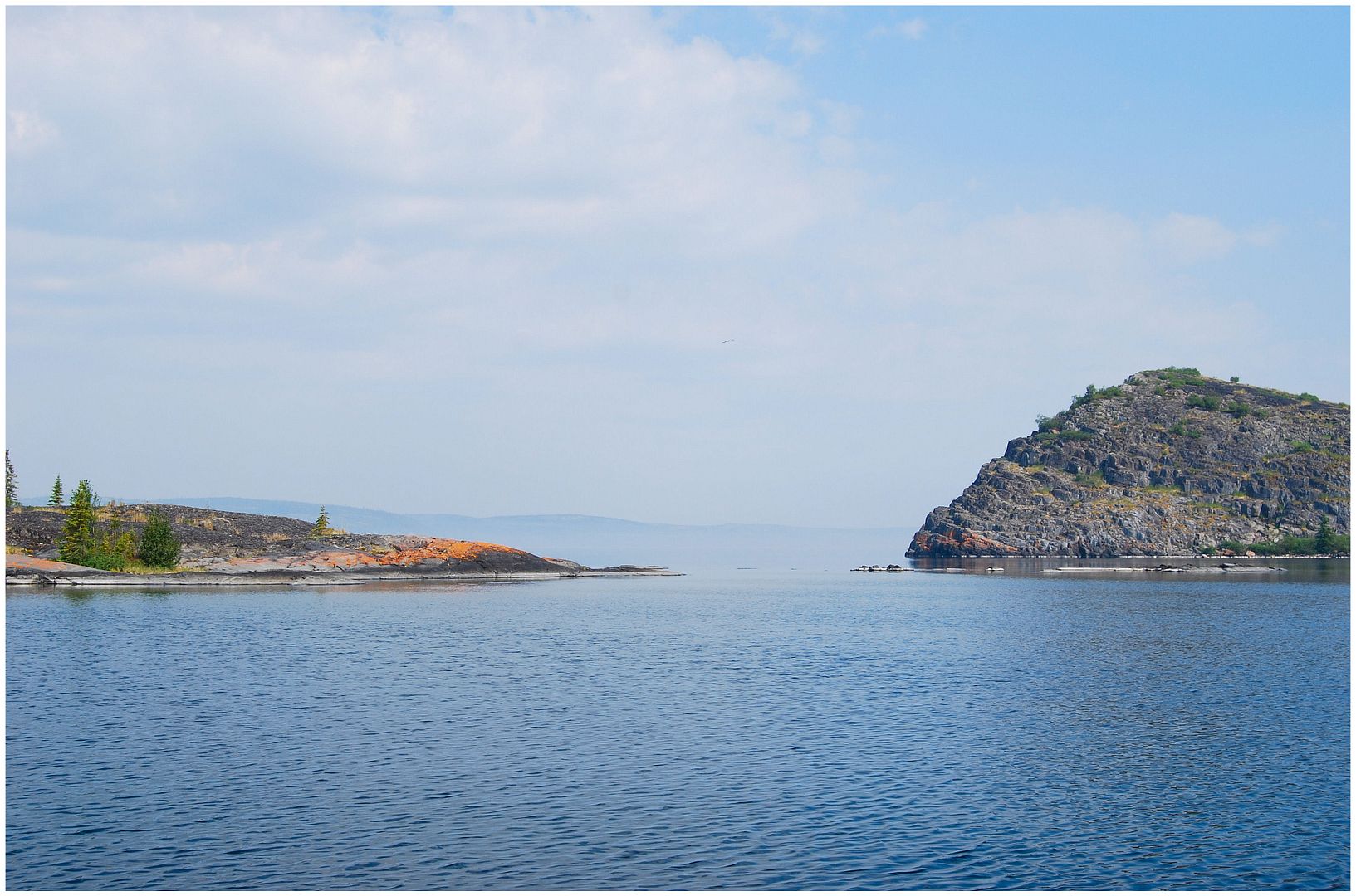 We no sooner came off plane when from the far shoreline a loud rumble of thunder echoed to us from across the sky. Visible enough through the haze we could see a front coming our way and Adrian took no time turning us around to head back. Being caught out where we were if a storm did come upon us, seas would turn rough. Being that it was near lunch anyways, we veered off into a back bay and beached the boat on a scenic little shorelunch spot, and waited to see what the weather would do.