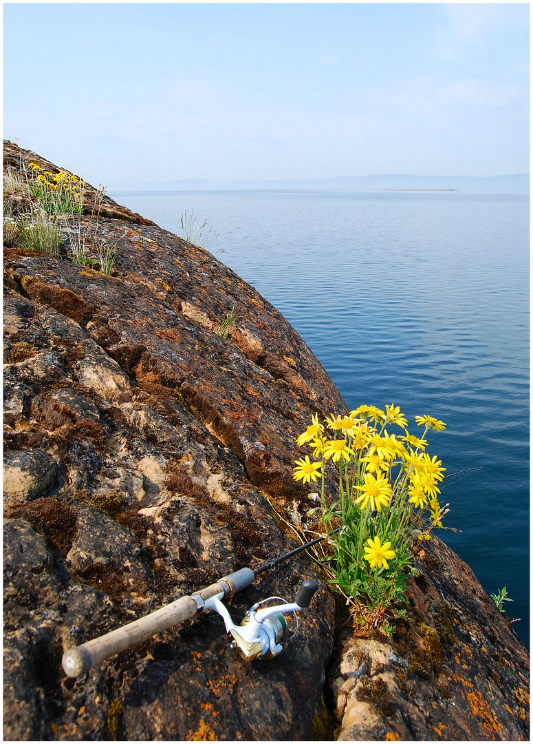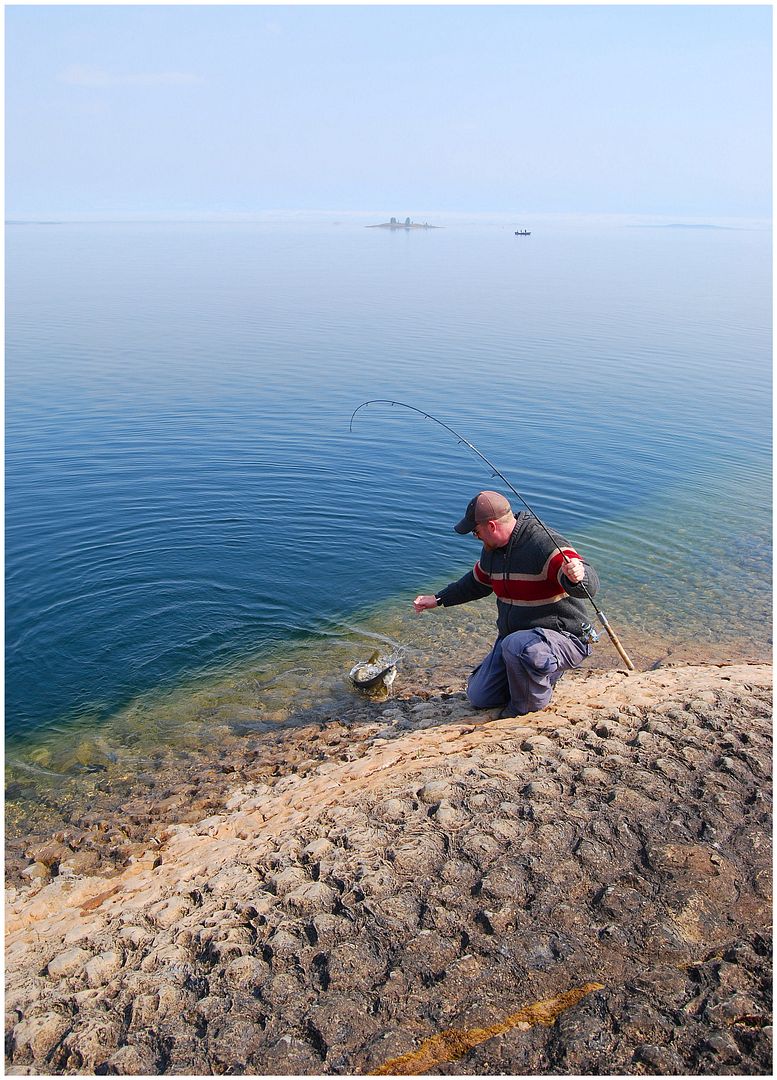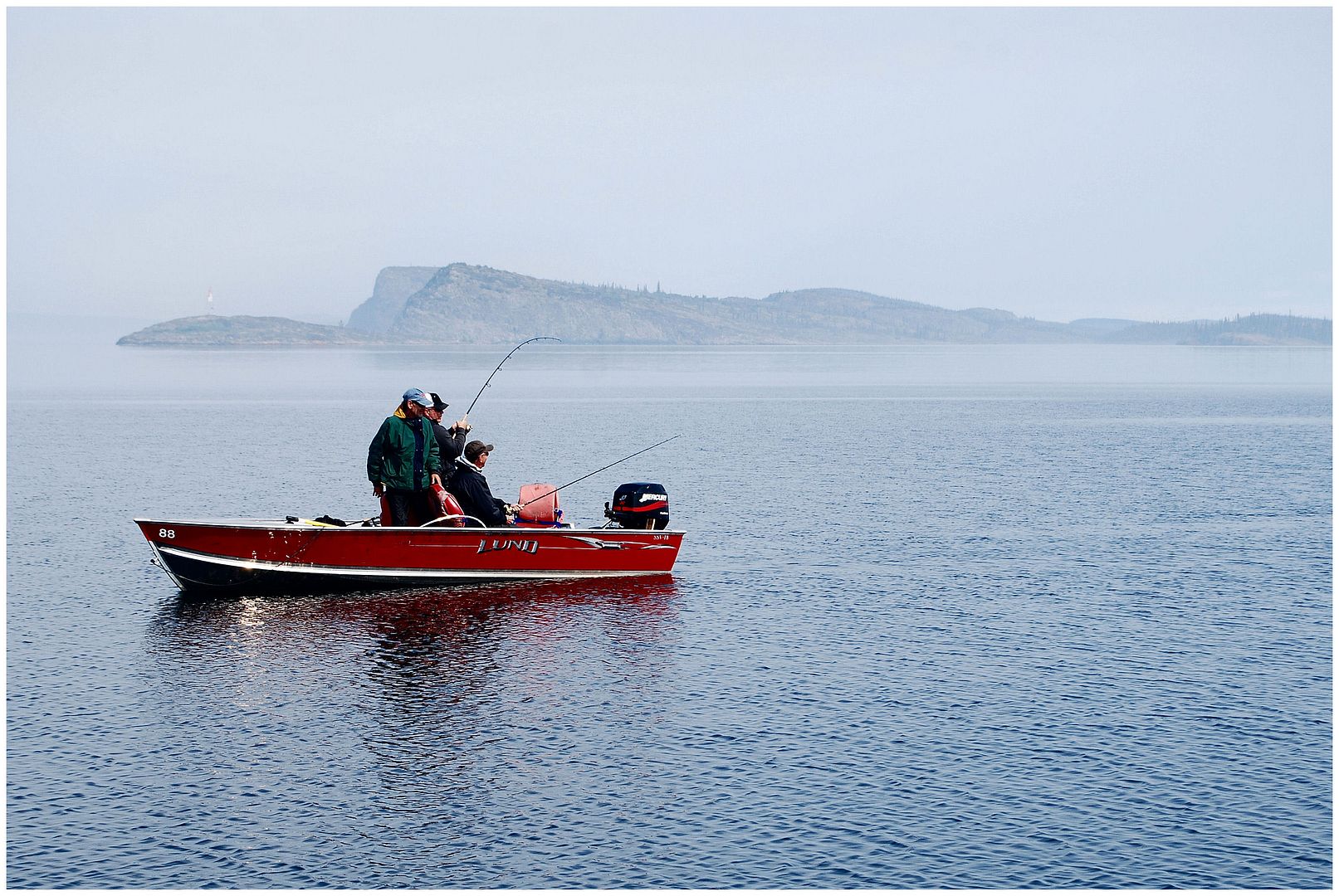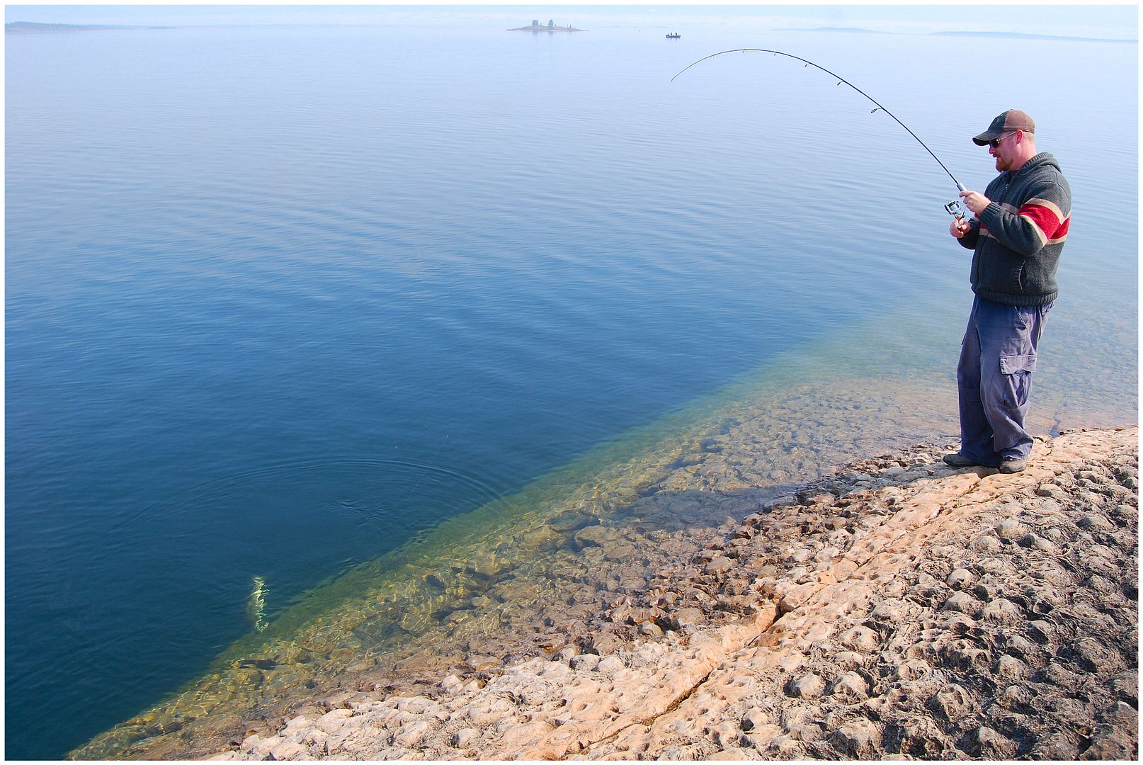 Not too sure about roe in the potato goulash it all tasted great, and once the meal was finished there would be a little time to get back to fishing. Half a cast away from shore, a boat trolled by following one of the cliffs and an angler reeled himself in a 14-pounder. With the grayling gear I couldn’t help but try nearby, and during then Bren was sneaking around with the camera capturing the action. No giant fish, but helluva spot to be standing and reeling ’em in.