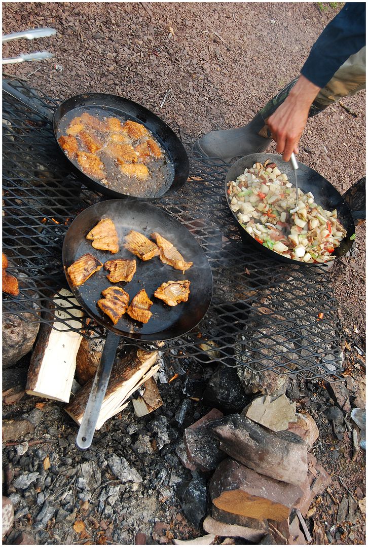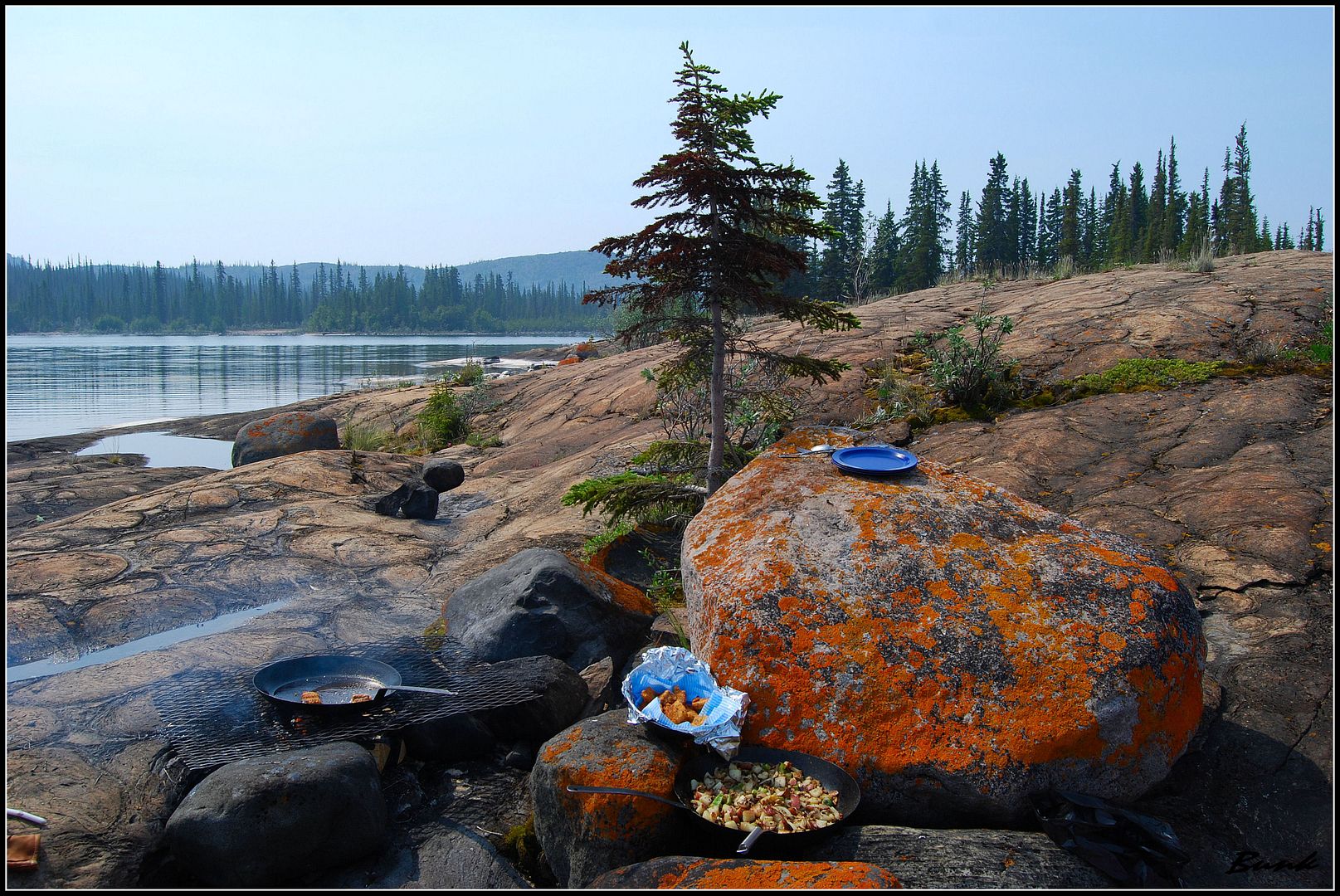Turning my gaze from north to south, Adrian was there in the distance sizzling up another laker masterpiece. The forest view beyond, it too was spectacular in it’s own right. Surely following my nose by now, over fossils to the food I walked, before taking the most favorite dinner setting snapshot, ever.
