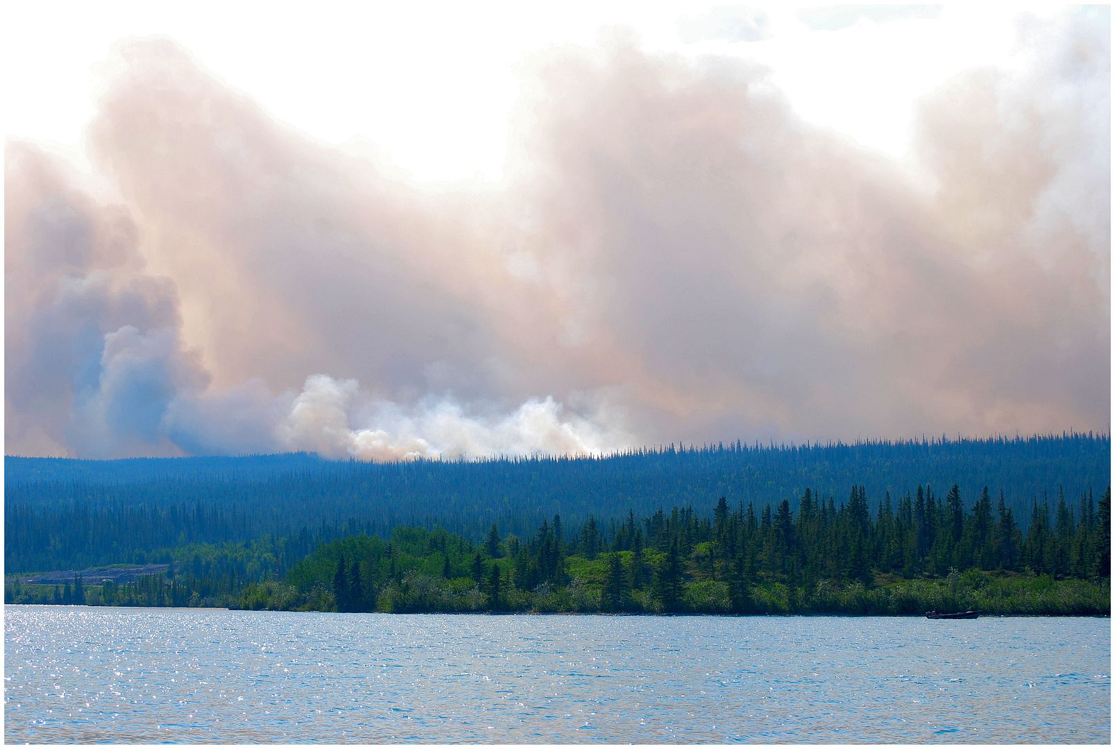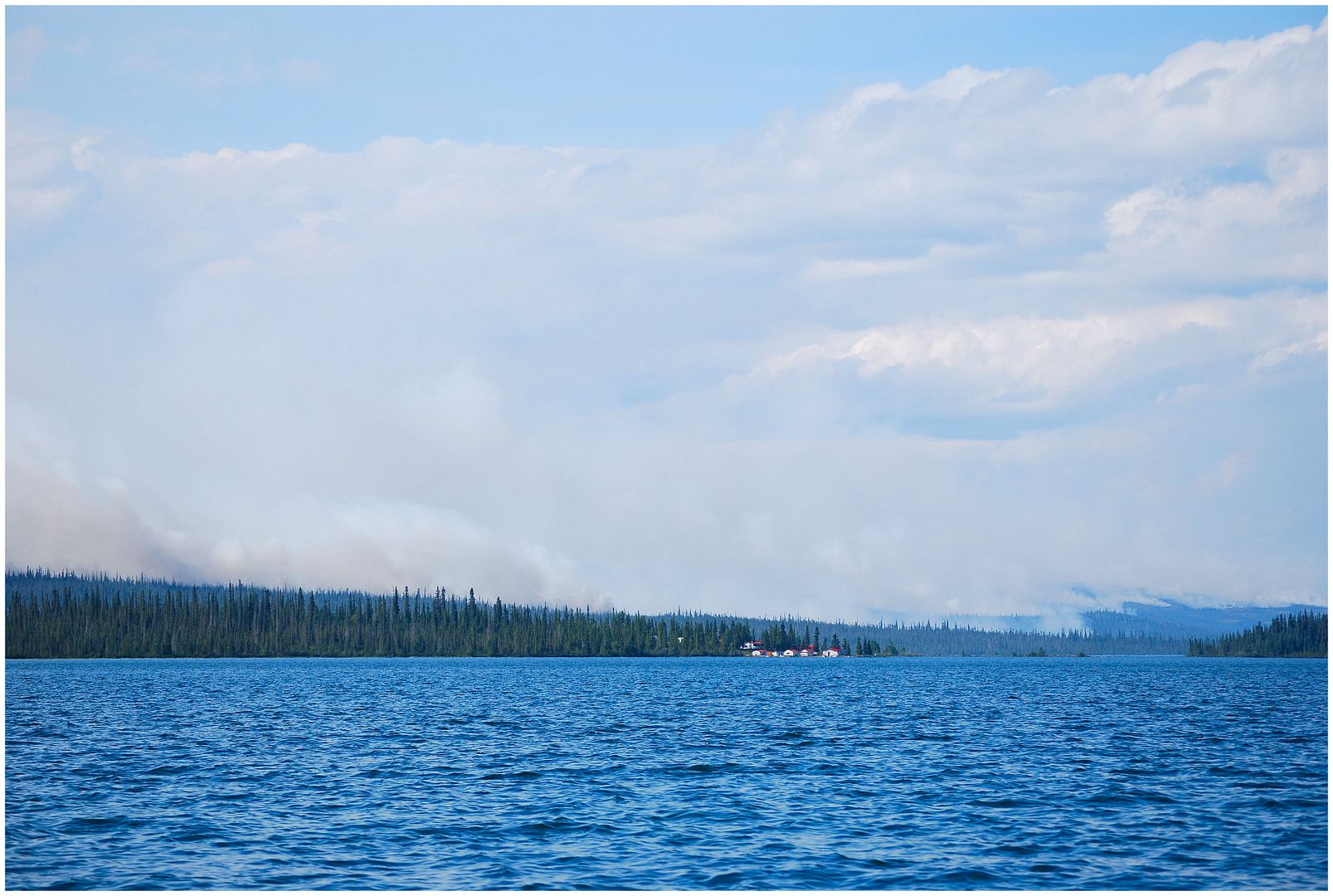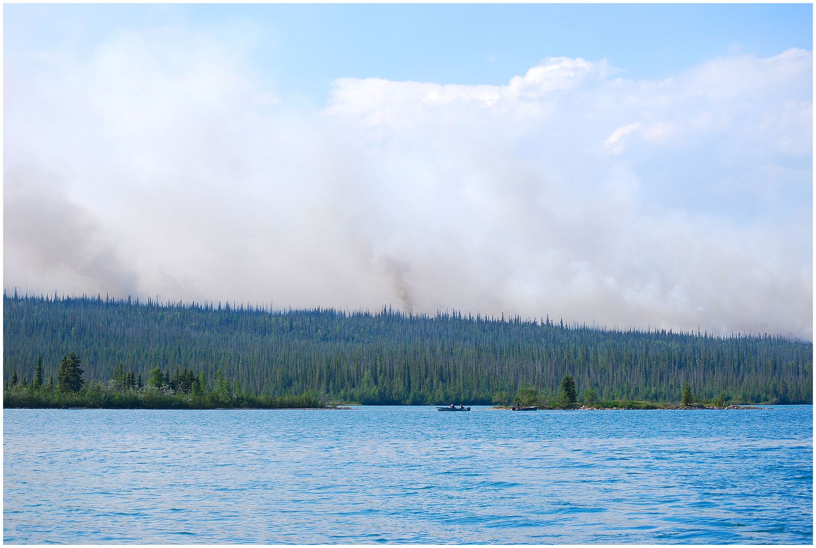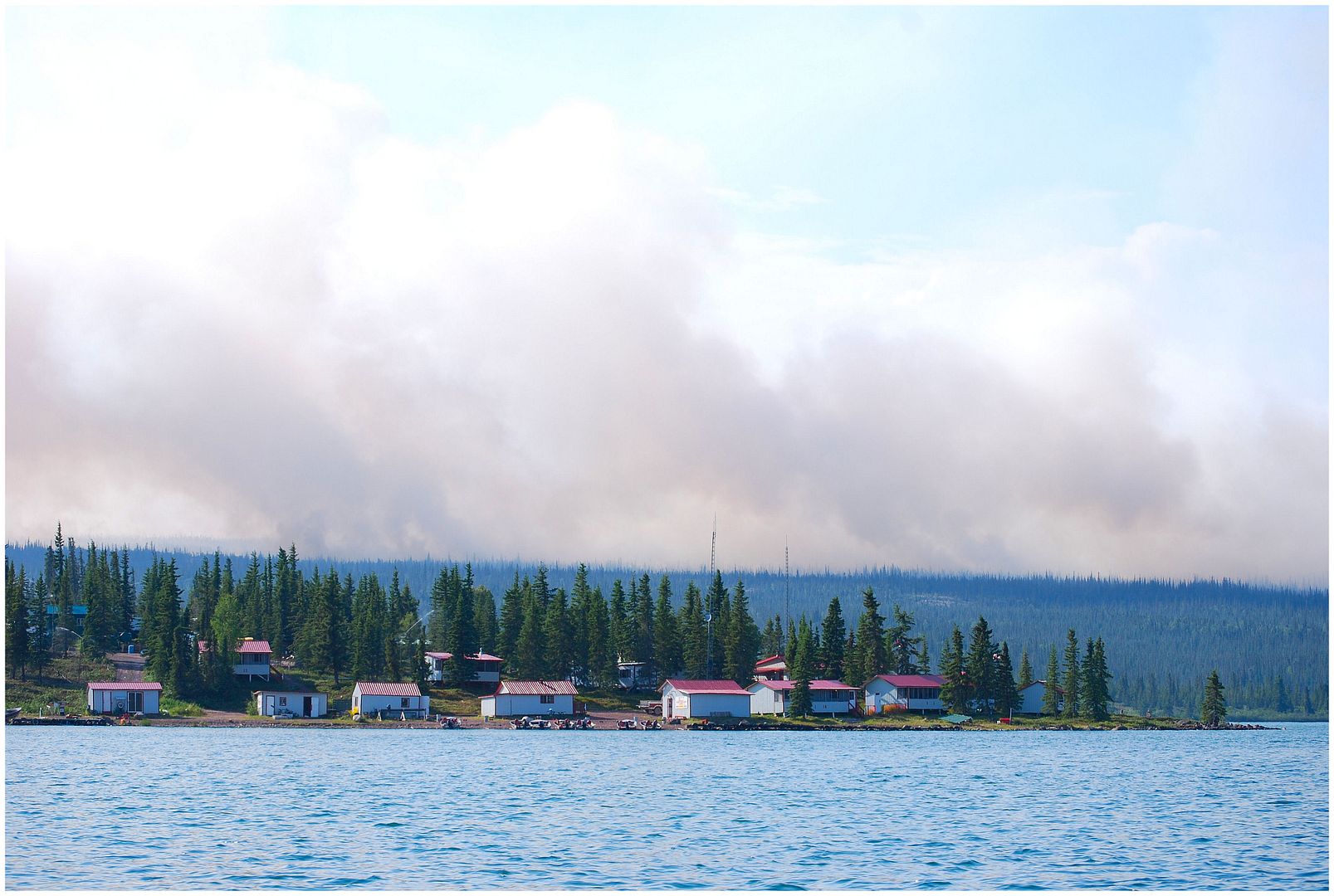 Nearing camp it was our guide Adrian’s livelihood which appeared most in question. The wrong wind, the burn was encroaching upon camp now and the firefighters had turned the sprinkler system on. Snapping pictures from afar while safe in our boat, the smell of smoke, snowing ash and odd burning ember fell into the lake around us, little black pieces of coal extinguished when touching upon the water. Guides with guests surely fished nervously nearby the lodge.