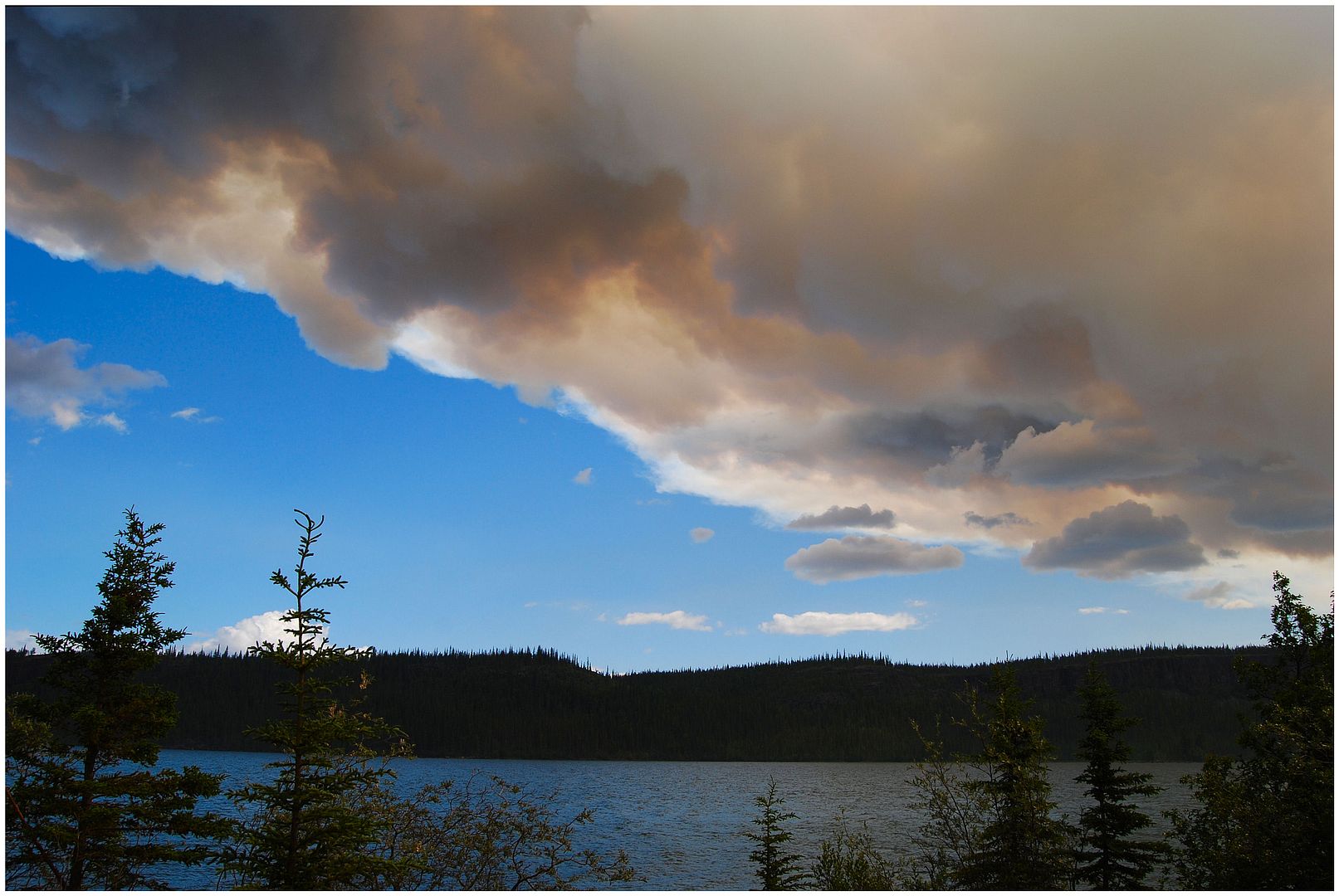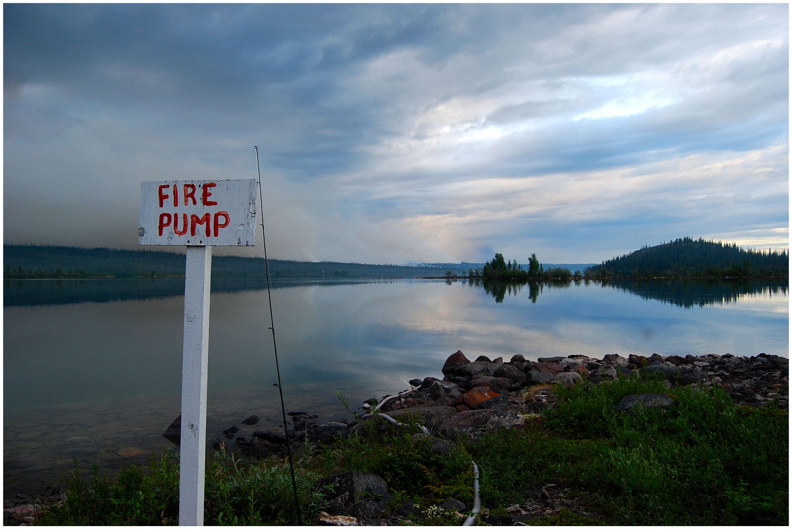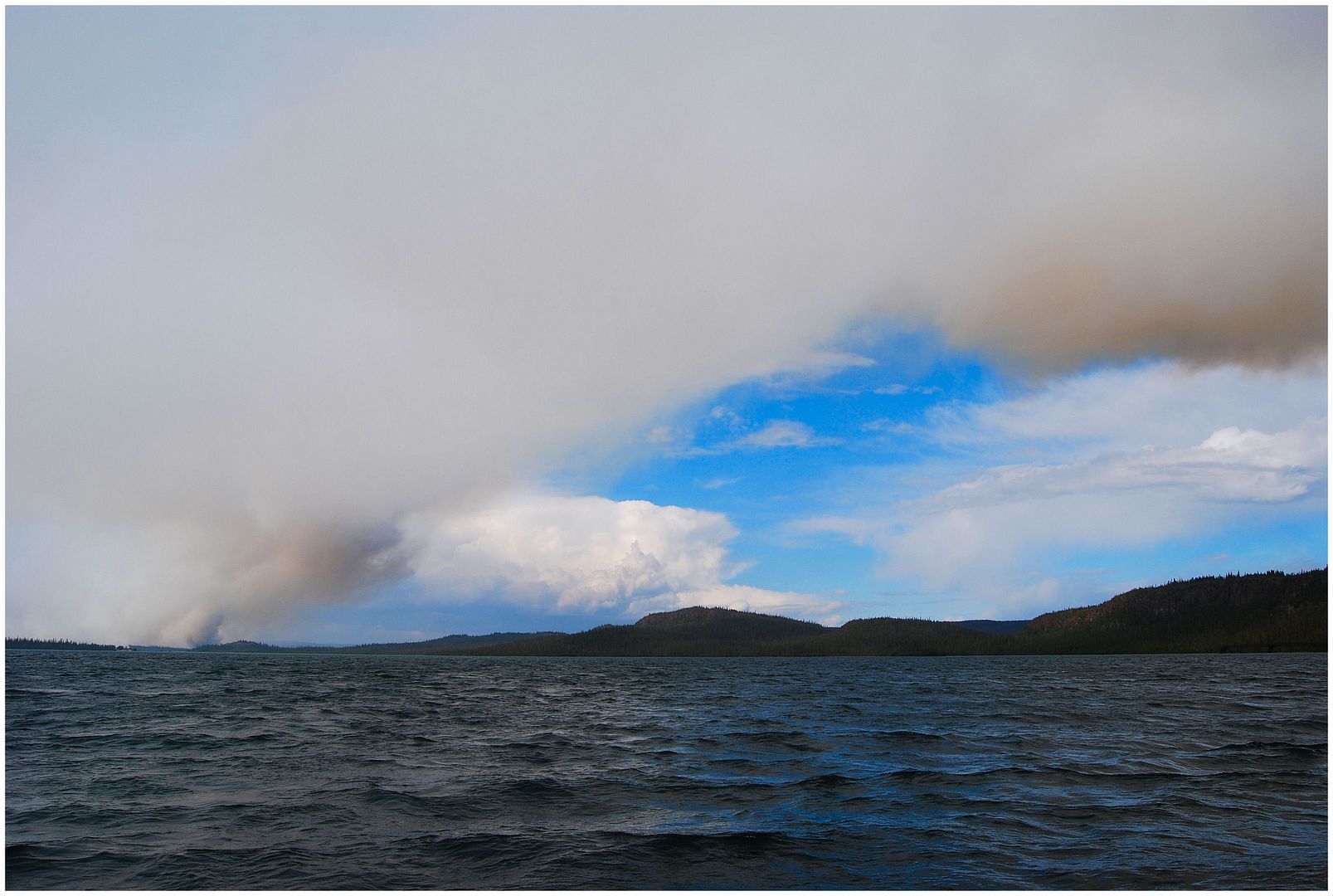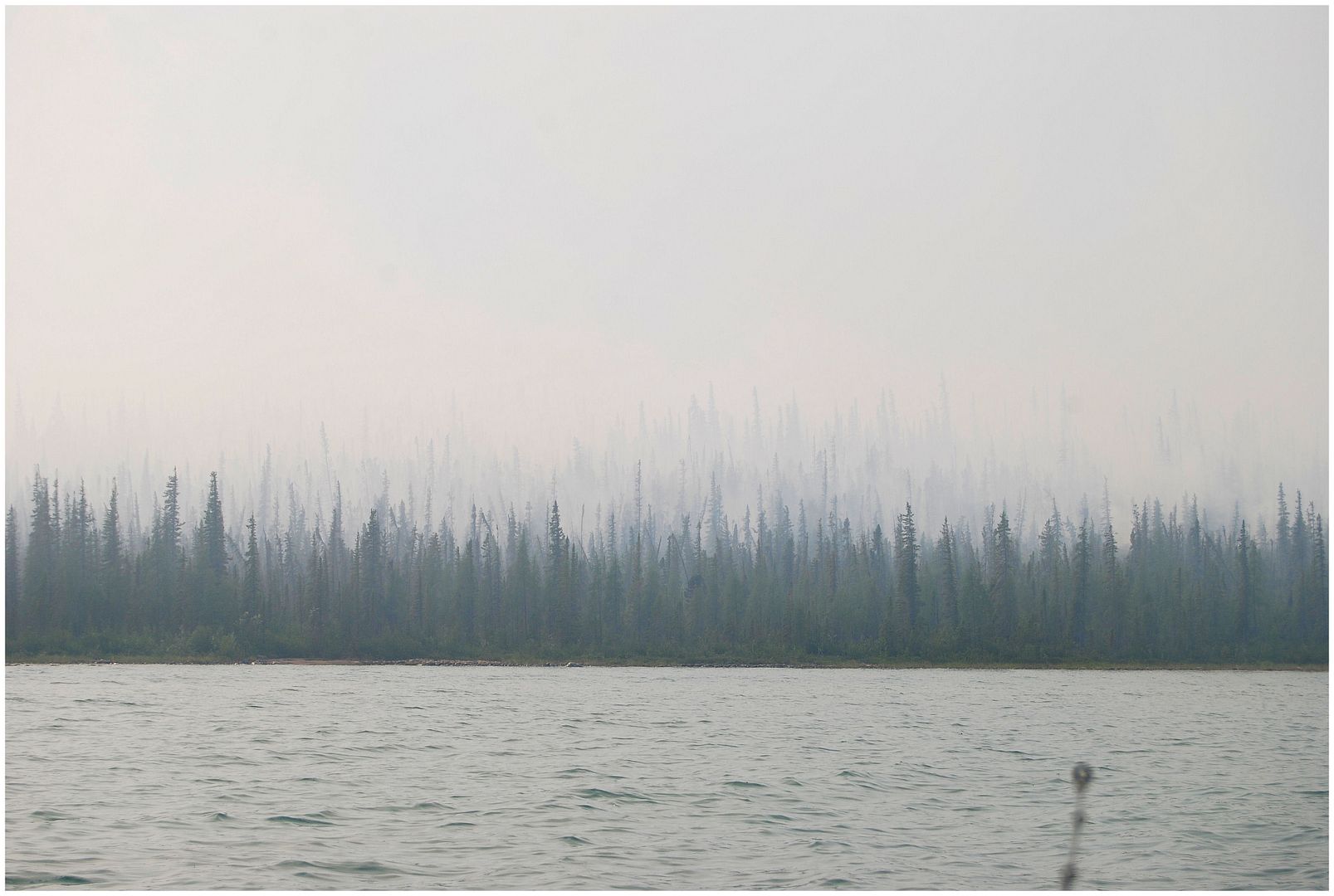 Nearing camp it was our guide Adrian’s livelihood which appeared most in question. The wrong wind, the burn was encroaching upon camp now and the firefighters had turned the sprinkler system on. Snapping pictures from afar while safe in our boat, the smell of smoke, snowing ash and odd burning ember fell into the lake around us, little black pieces of coal extinguished when touching upon the water. Guides with guests surely fished nervously nearby the lodge.