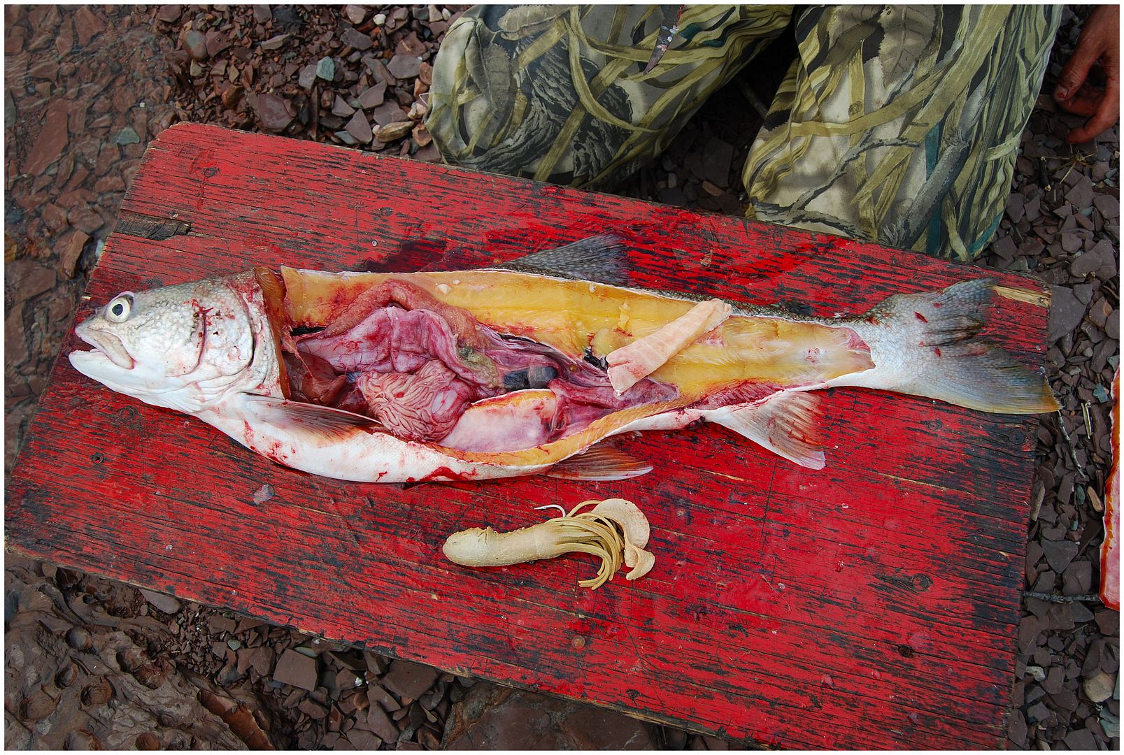 We and everyone around us were catching lakers all morning. One boat by noon boasted 25 to 30 some redfins alone. Figuring we’d eat before others to enjoy some more quiet fishing afterwards, Adrian took us ashore this mind-blowing island for lunch.