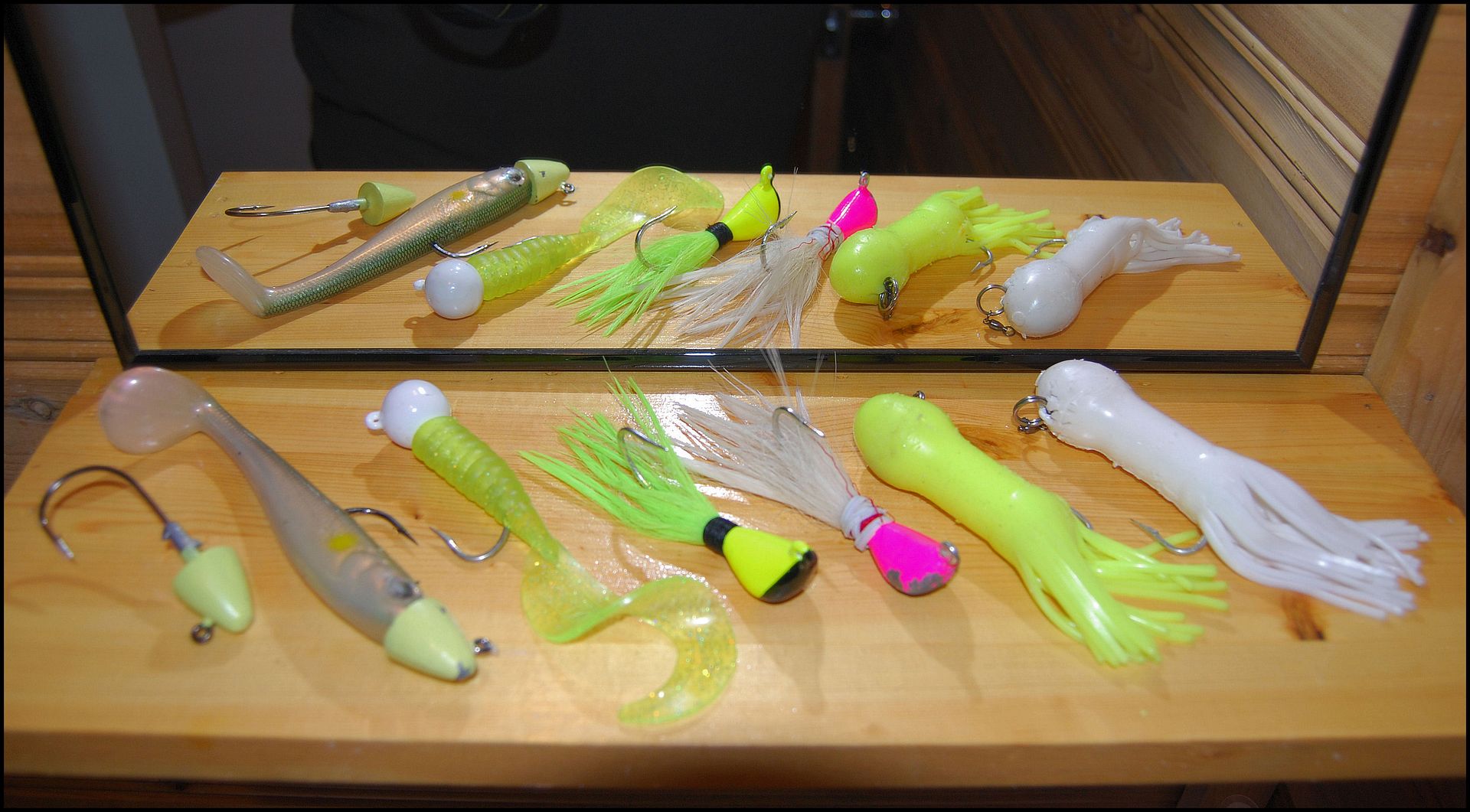 The lakers were hungry for our jigs. Evening before I picked up a mixed bag of white and chartreuse tubes. Squeezing the two-ounce heads into these over-sized rubbers, I aptly named them Big White Dick and Martian Dick, to which we all kept laughing while Adrian took it way further into every kind of funny pun to go along with lakers biting on these lures. This first pic shows some of the Husky’s we would troll while on Bear, while the following depicts the different lures the Slave fish were after.
