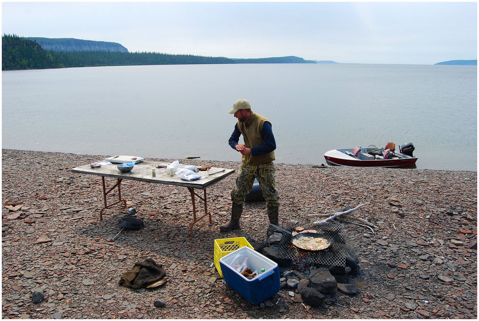 Gary, Greg, Bryce, Adrian, Bren and myself all joined up for shorelunch on a nearby island. Breaking away from the group while the meal was being prepared, I stood on the island point and bombed casts into and across the wind, with hopes of catching a grayling or two on the ultralight.