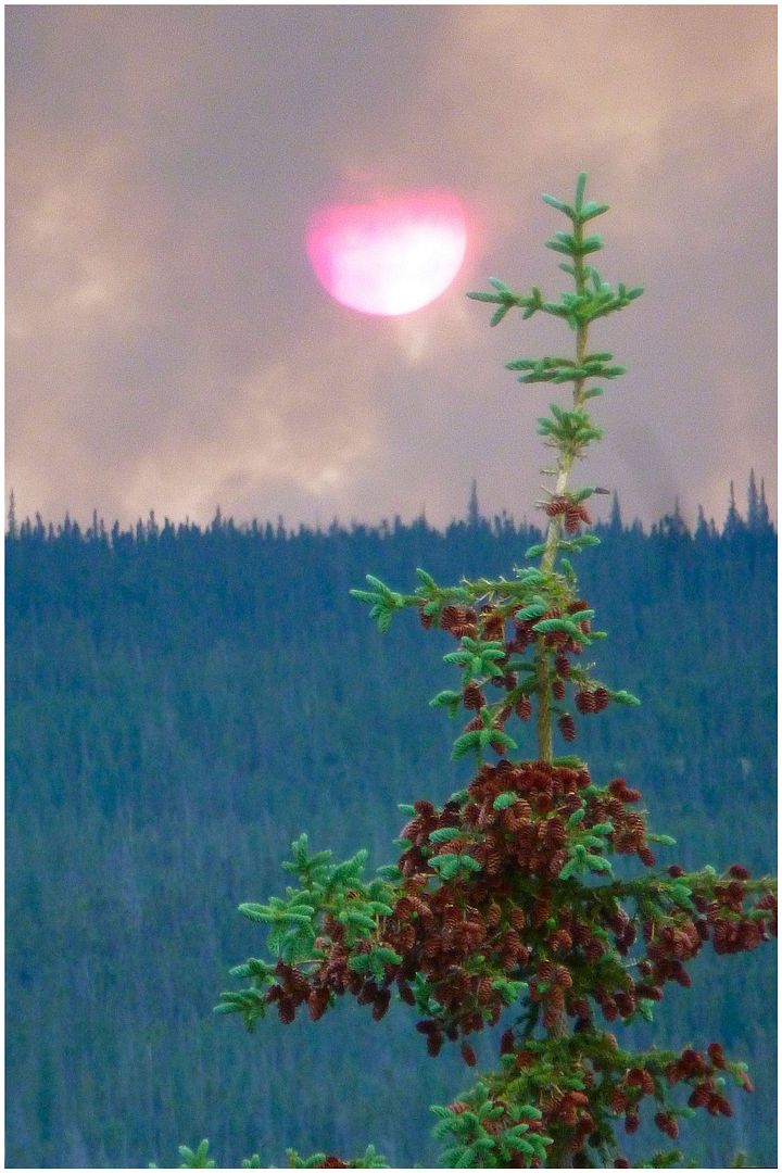 Behind camp along the runway large reserves of fuel are stored. The fire through the week had climbed down several sets of higher ridges to where it just now north of camp singed trees along the waters edge. Within a mile of Plummer’s lodge the forest was burning, and like the odd little firecracker or child’s sprinkler, we could watch as the tree tops of dry black spruce would suddenly crackle and explode. If the fire is to reach the runways fuel and equipment, there could be a much more grand show.