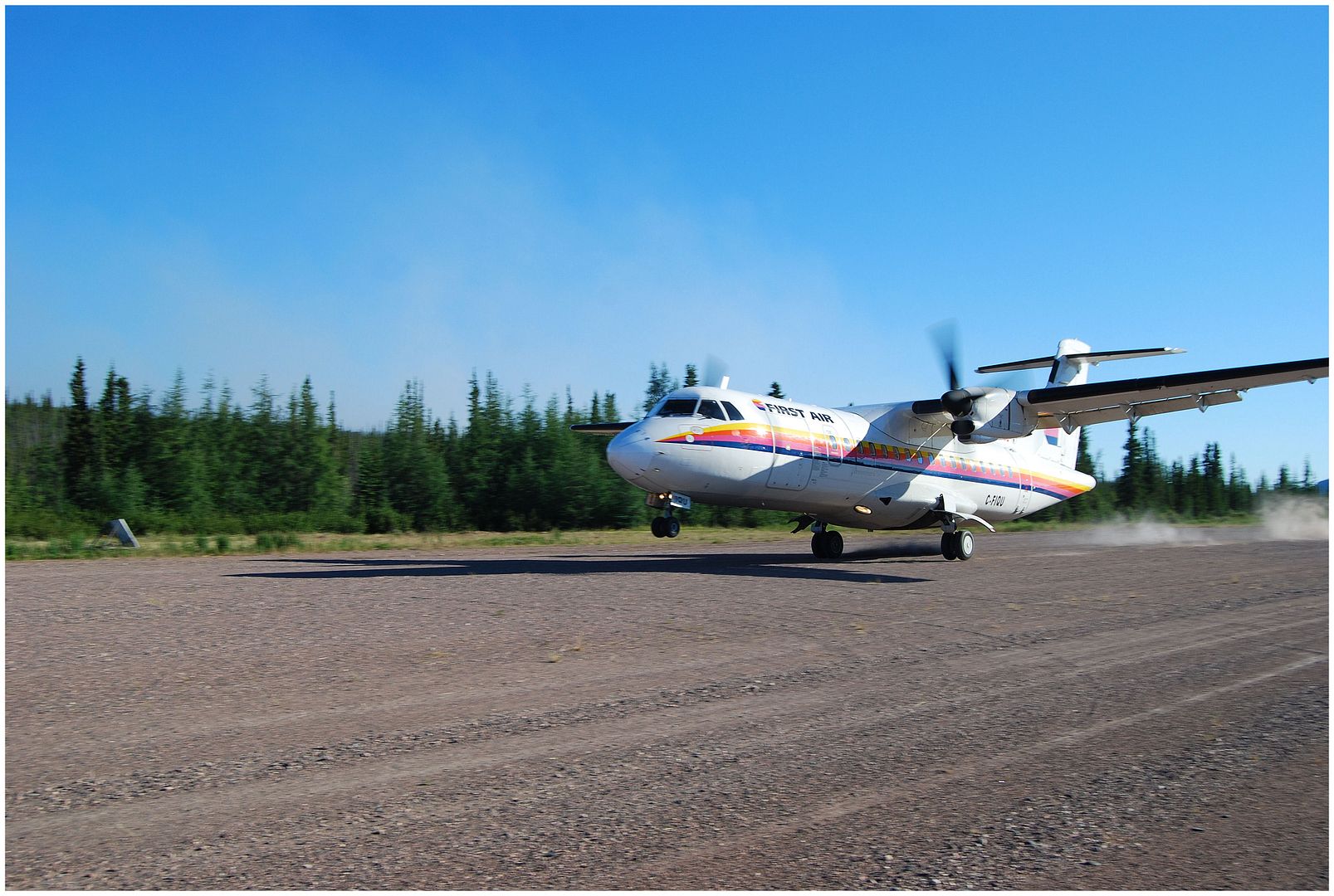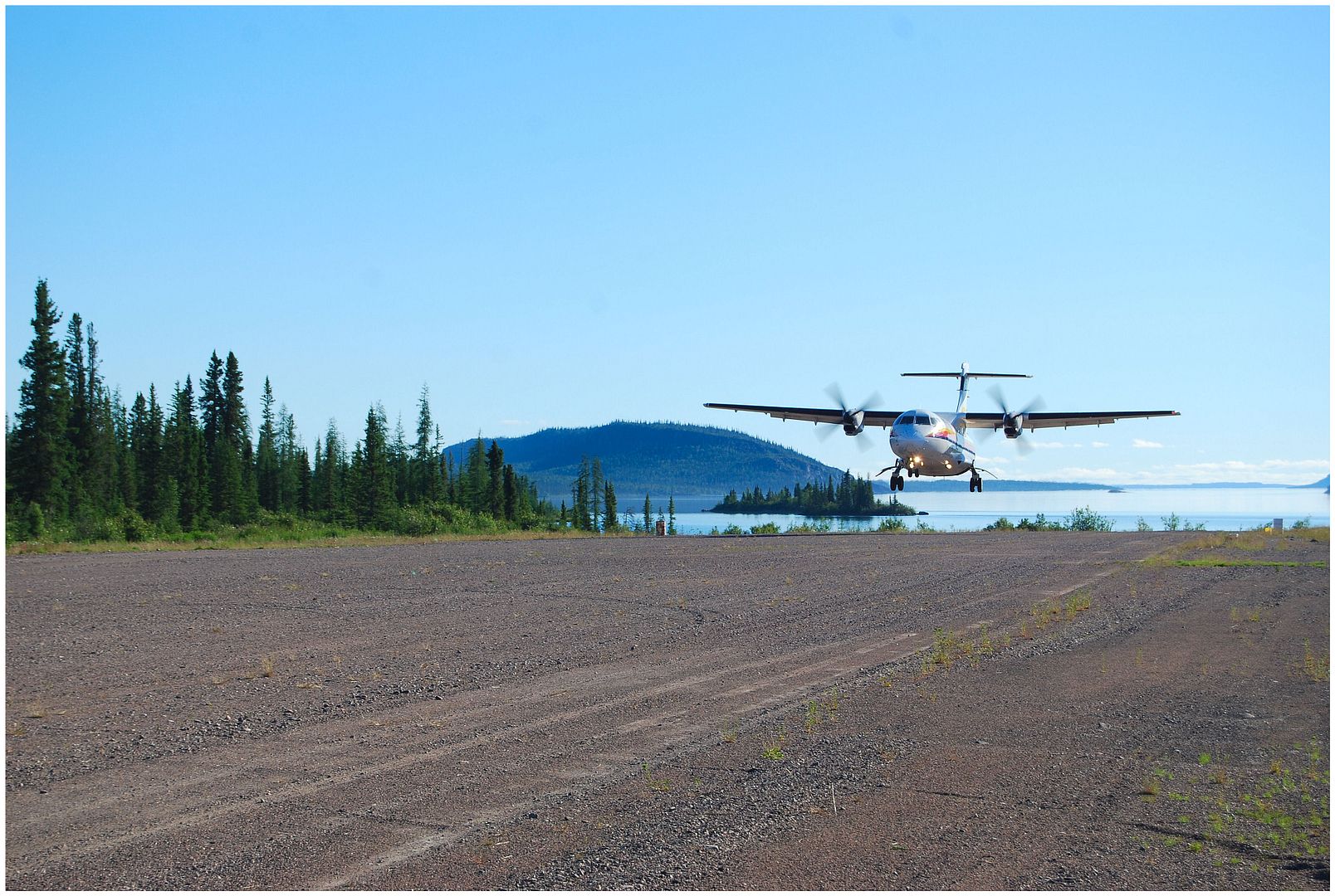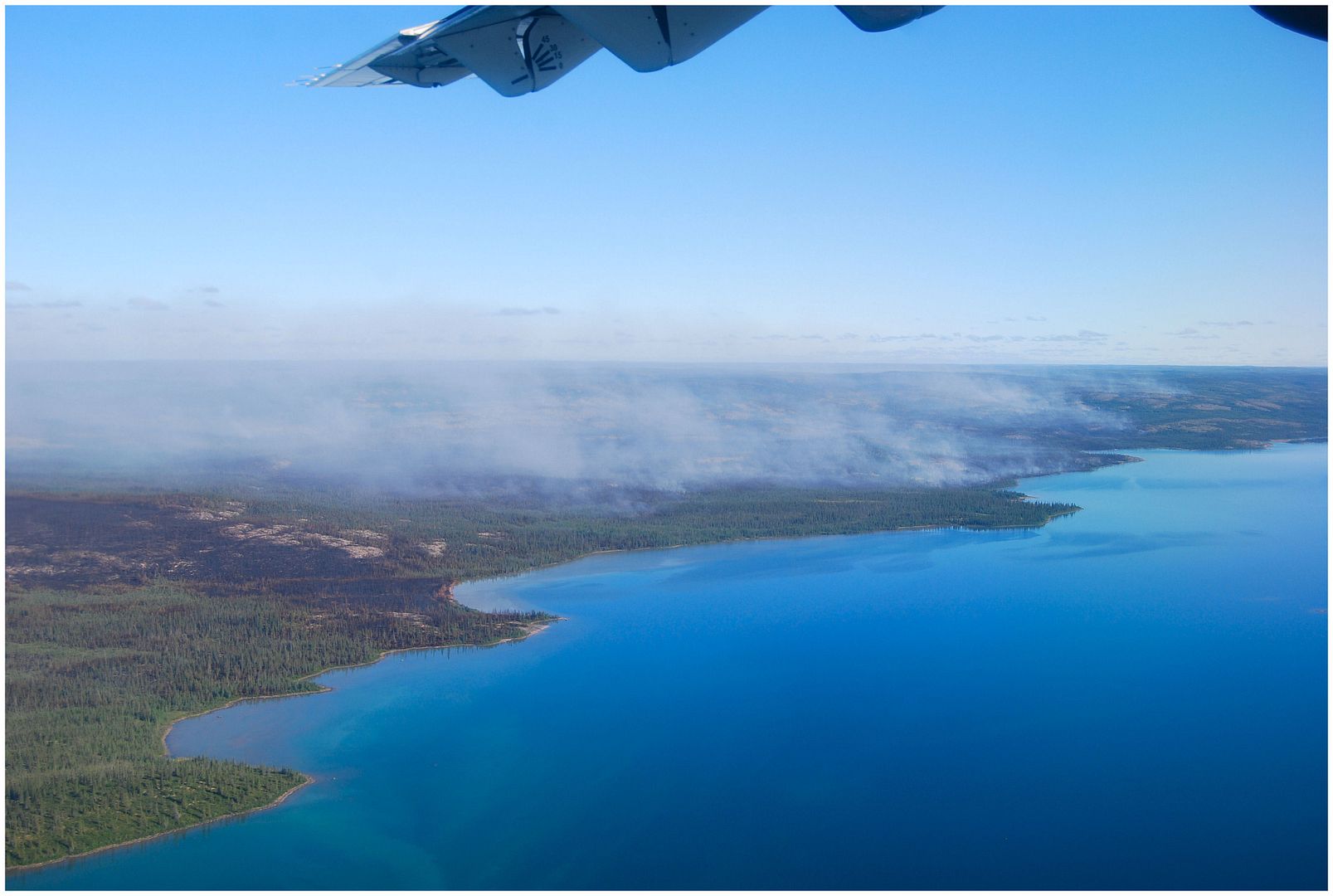 Approaching the time our plane would be scheduled for take-off from Yellowknife to fly this way, many prayers must have been answered as, there was this sudden slight breeze from the south which blew all smoke inshore to land, and away from the airstrip. We saw little of the lodge manager Grant through the entire week, but it was a welcome sight when he waved us aboard the bus to shuttle all over to the runway. Minutes later, total safety and peace of mind flew in over the lake, and soon staff and guests were airborne, heading home or onward to Bear.