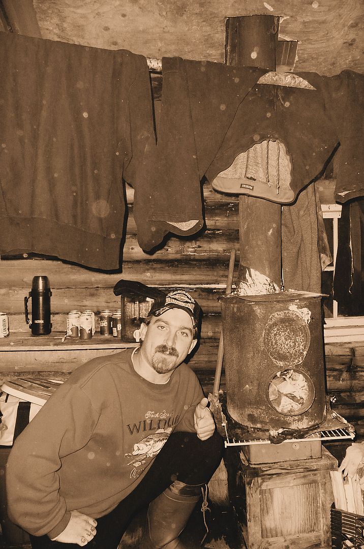 The weather wasn’t really expected to let up though. It was forecasting scattered showers and possible thunderstorms for the next two days. Having been given only a few short rainless breaks during the ride up river I decided to take good shelter from the mess of it all. An old run down cabin at the mouth of the Abitibi River I have often used would surely be the perfect place. Strange thing was, when I arrived there I heard from inside the cabin a clanking of beer bottles and a man’s voice singing that Tiffany song “I think We’re Alone Now.” I wrapped on the door as it all just sounded too familiar……….. AND LOW AND BEHOLD IT’S MY THREE FINGERED SLOTH BUDDY, FLOATFISHIN’!!!